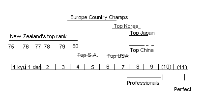 In a previous Kamikaze kolumn we discussed the relative ranks used in the world and where New Zealand fitted in. The discussion was summarised in the diagram. We can see that the strongest New Zealanders in 1980 were 4-dan. In the years past there has been some improvement in the standard here yet the strongest players are still called 4-dan. I would like to have a look at this.